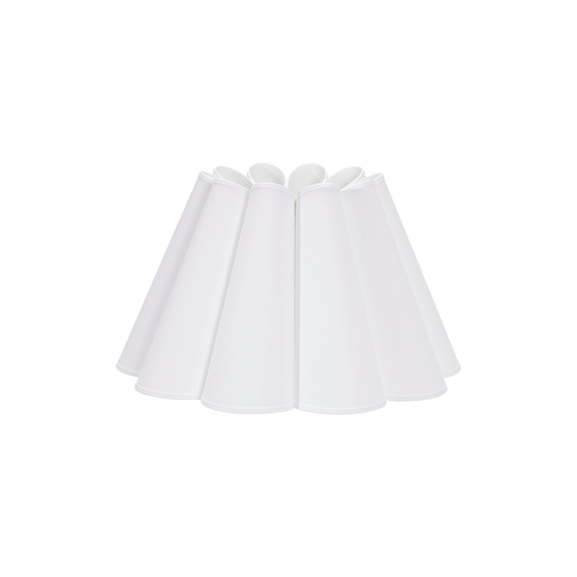Lampskärm Freja med sin mjuka blomblads liknande form. Handsydd blad för blad med kantband i vitt slätt bomullstyg. Insida med vitt laminat som ger ett fint sken. Diameter nedtill 32cm, upptill 16cm och höjd 19cm. E27 fäste som sitter 4,5cm från nederkant.