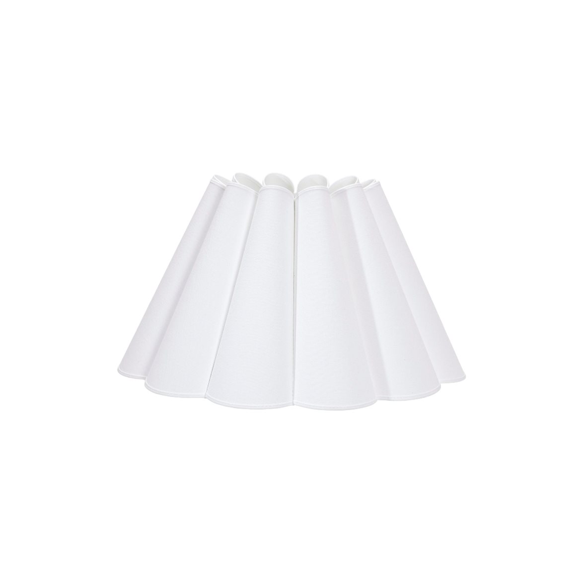 Lampskärm Freja med sin mjuka blomblads liknande form. Handsydd blad för blad med kantband i vitt slätt bomullstyg. Insida med vitt laminat som ger ett fint sken. Diameter nedtill 45cm, upptill 21cm och höjd 25cm. E27 fäste som sitter 4,5cm från nederkant.