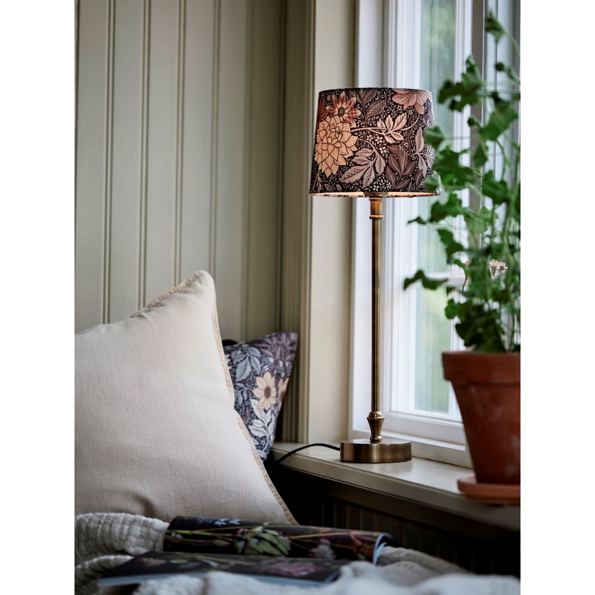 Lampskärm med mönstret Dahlia Garden i brun/puderrosa färgställning. Handmålat mönster av designern Jenny Hahne Gadd för Boråstapeter. Låt de praktfulla dahliorna och sirliga bladen flytta in i ditt rum.