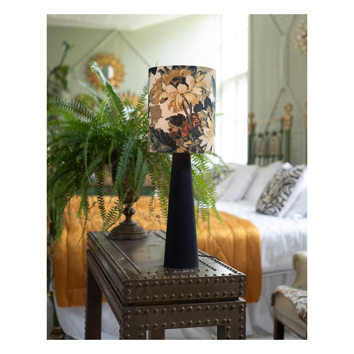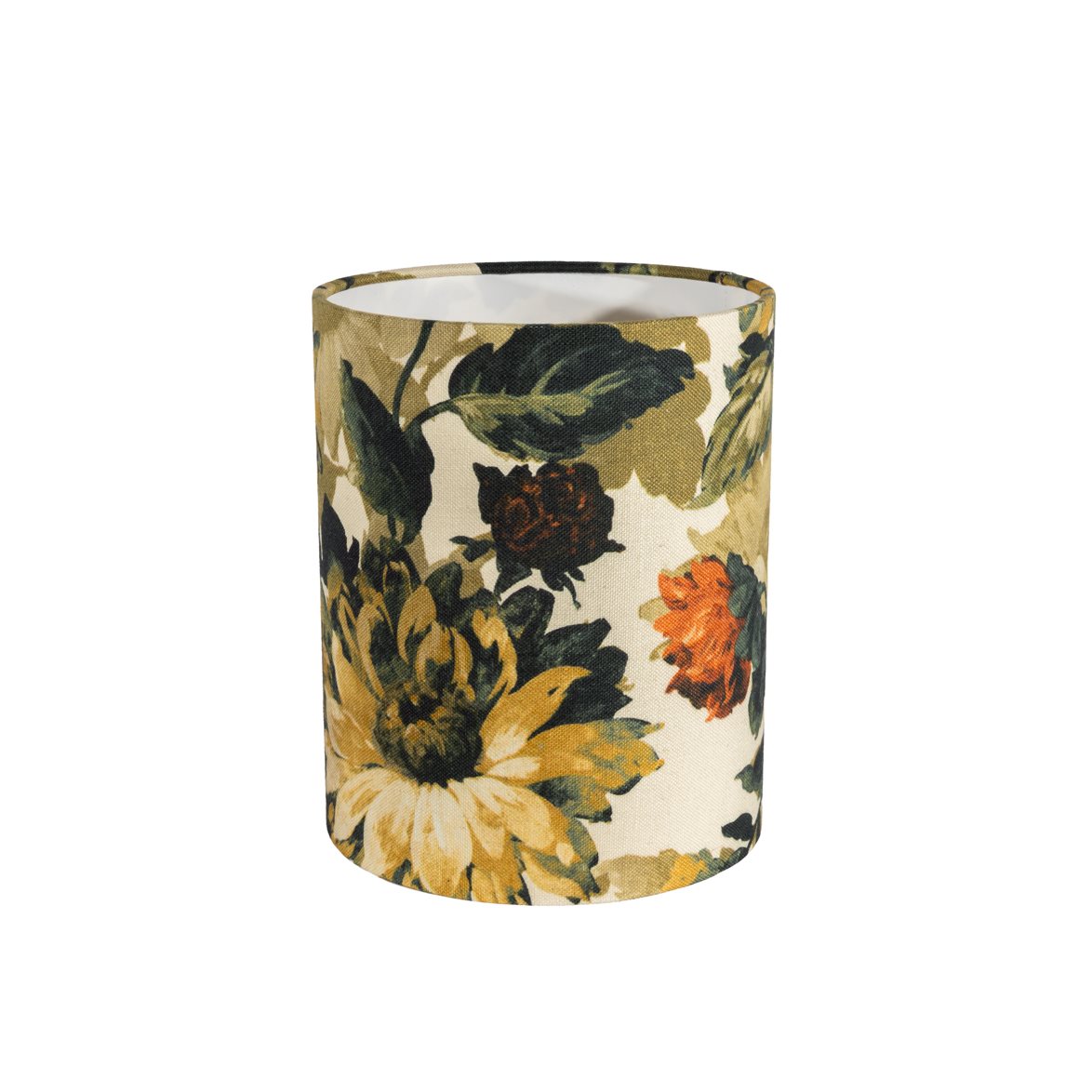Cylinderformade lampskärmar passar in i många inredningsstilar. De kan smälta in både i retrostilen och i mer modernt inredda rum. Vår cylinderskärm är handsydd, här i tyget "Solros" ett tryckt tyg i vackert mönster med mustiga höstfärger. Kanterna är fint invikta. Cylinderskärmarna finns i två storlekar och flera färgställningar.