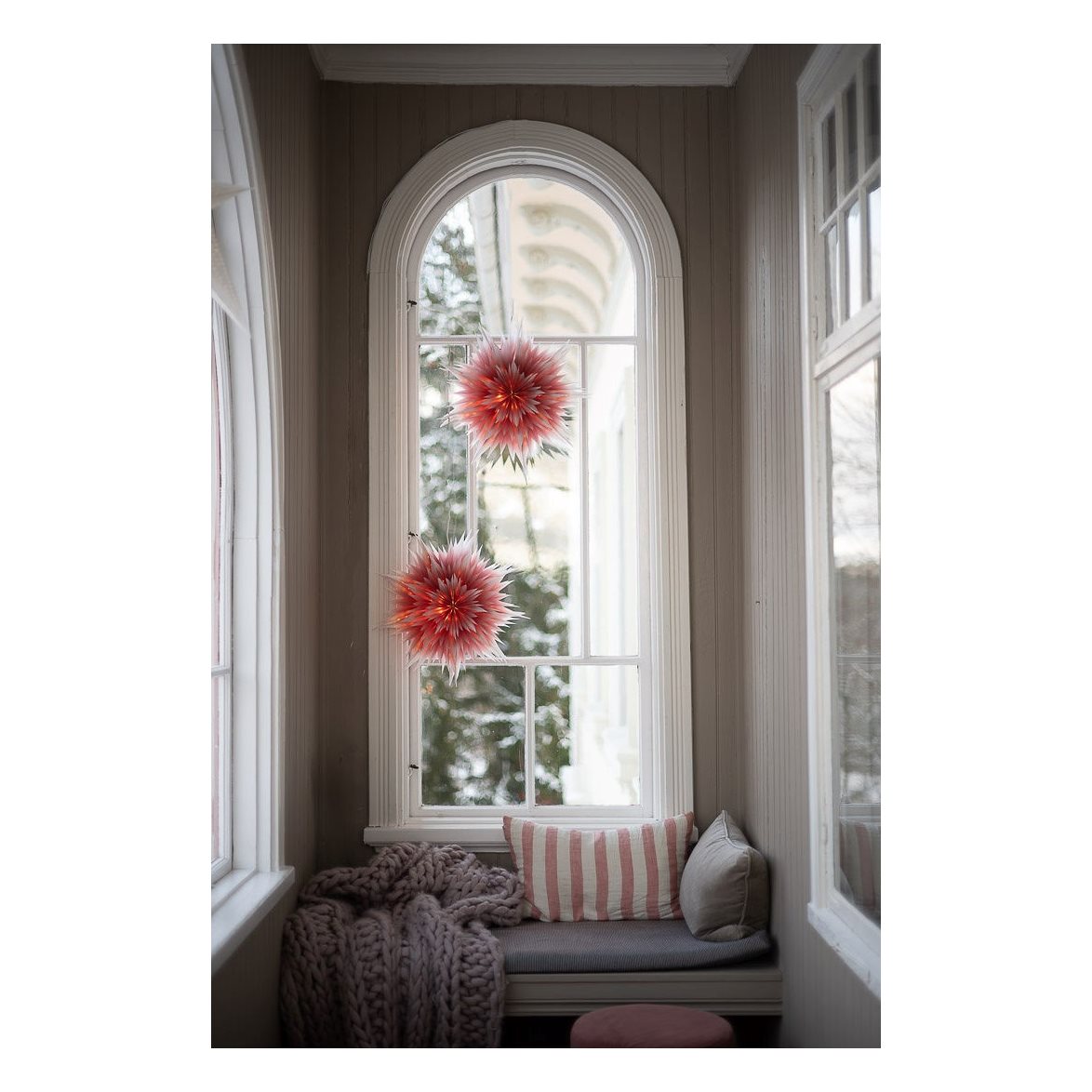Roxy är en tredimmensionell stjärna av smörpapperskvalitet. Den viks förhand och är uppbyggd i tre olika lager. Pappret är tryckt med en "ombreeffekt" dvs det är ofärgat längst ut på spetsarna och blir mer intensiv färg ju längre in mot stjärnans mitt. Roxy finns i olika storlekar och färger. Använd endast med LED lampa